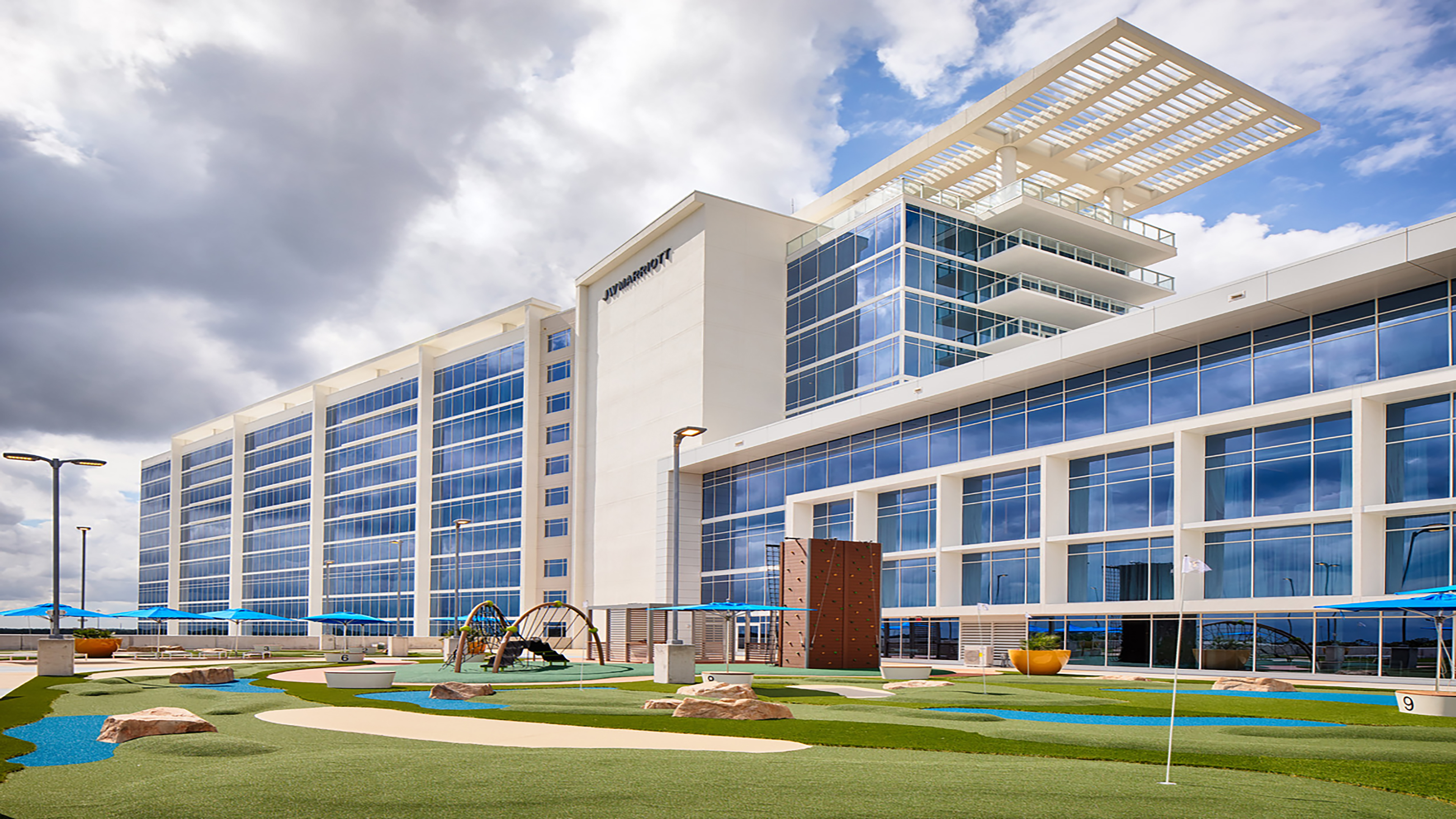 The JW Marriott Bonnet Creek provides an elevated hospitality experience with a contemporary design, central to Orlando’s amusement park attractions. The new 14-story, 516-room destination resort features a spa with 10 treatment rooms, a fitness center, children’s playroom, teen center, rooftop destination bar, several restaurants, cafés, and lounges. Additionally, the hotel provides 50,000 SF of meeting space and a 23,000 SF ballroom to accommodate a variety of events. Exterior amenities include a 944-car parking garage, two pools, a hot tub, outdoor pool bar, tennis court, basketball court, miniature golf course and outdoor function space. This project included an aggressive design and build schedule which included extensive coordination with multiple design partners. EXP rose to the challenge and provided a successful, fully integrated lighting, technology design and building engineering design to meet the client’s and brand requirements. Located near numerous major themed entertainment parks, the project required specific lighting design to meet the needs of a high-end luxury resort but with family-friendly themes. Extra care was given to amenities such as the splash pad, family pool, climbing wall and kid’s club. With main views of the hotel from the I-4 highway and exiting nearby themed entertainment parks, the south hotel tower roof element was designed as a beacon in the night sky. With little signage on the building, the façade illumination was important to the design. The exterior porte cochere was designed to admit daylight illumination during the day and transform its mood with point source illumination for the night scene.